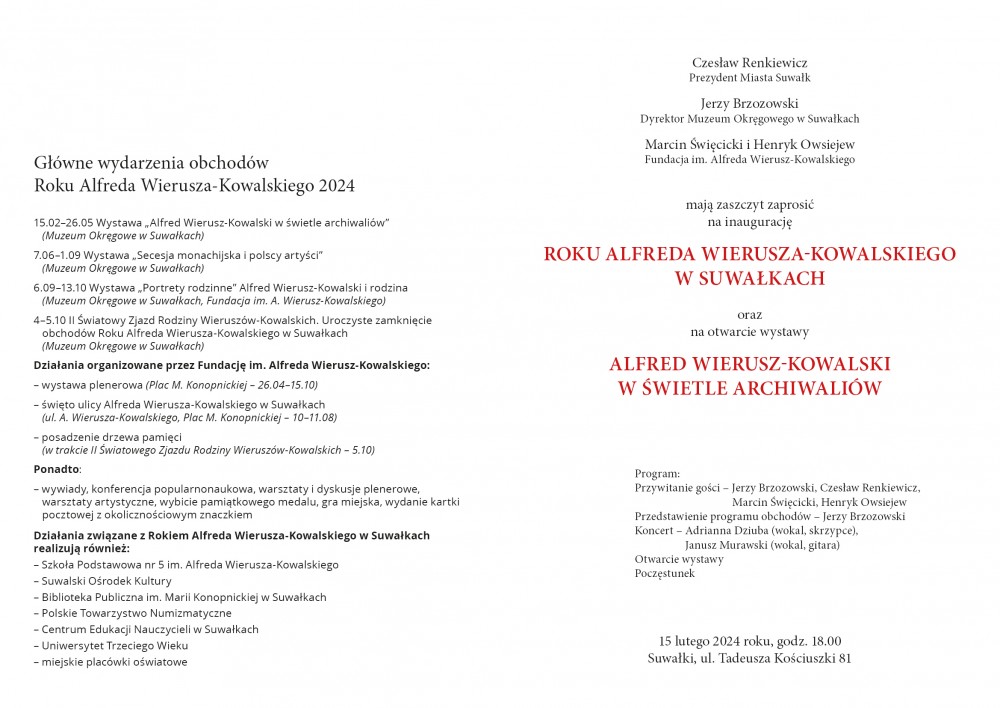 Rok 2024 został ustanowiony przez Radę Miejską w Suwałkach Rokiem Alfreda Wierusza-Kowalskiego. W ten sposób postanowiono oddać hołd wybitnemu artyście szkoły monachijskiej w 175. rocznicę urodzin.