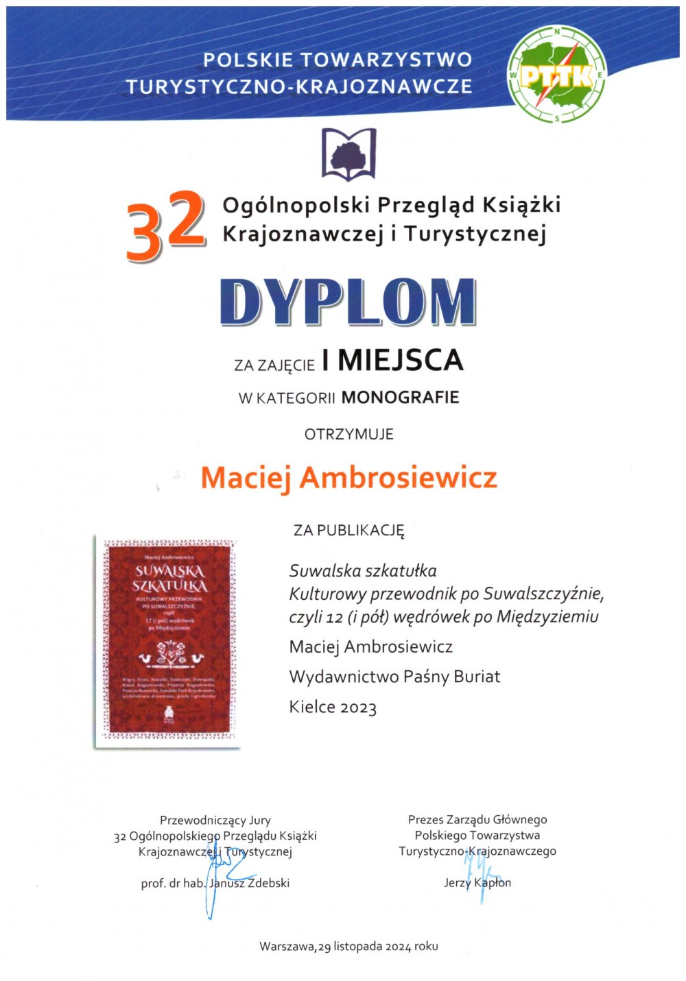 Książka "Suwalska szkatułka. Kulturowy przewodnik po Suwalszczyźnie" Macieja Ambrosiewicza zajęła pierwsze miejsce w kategorii "Monografie" podczas Ogólnopolskiego Przeglądu Książki Krajoznawczej i Turystycznej.