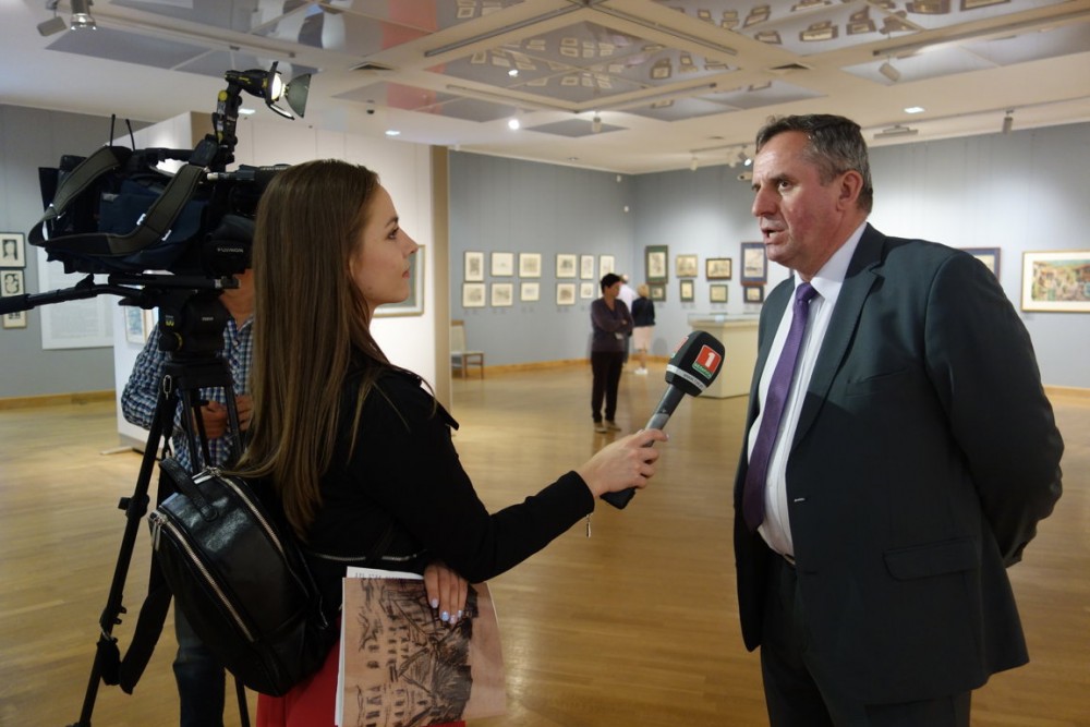Jerzy Brzozowski udziela wywiadu 1 programowi Telewizji Białoruskiej na temat wystawy.