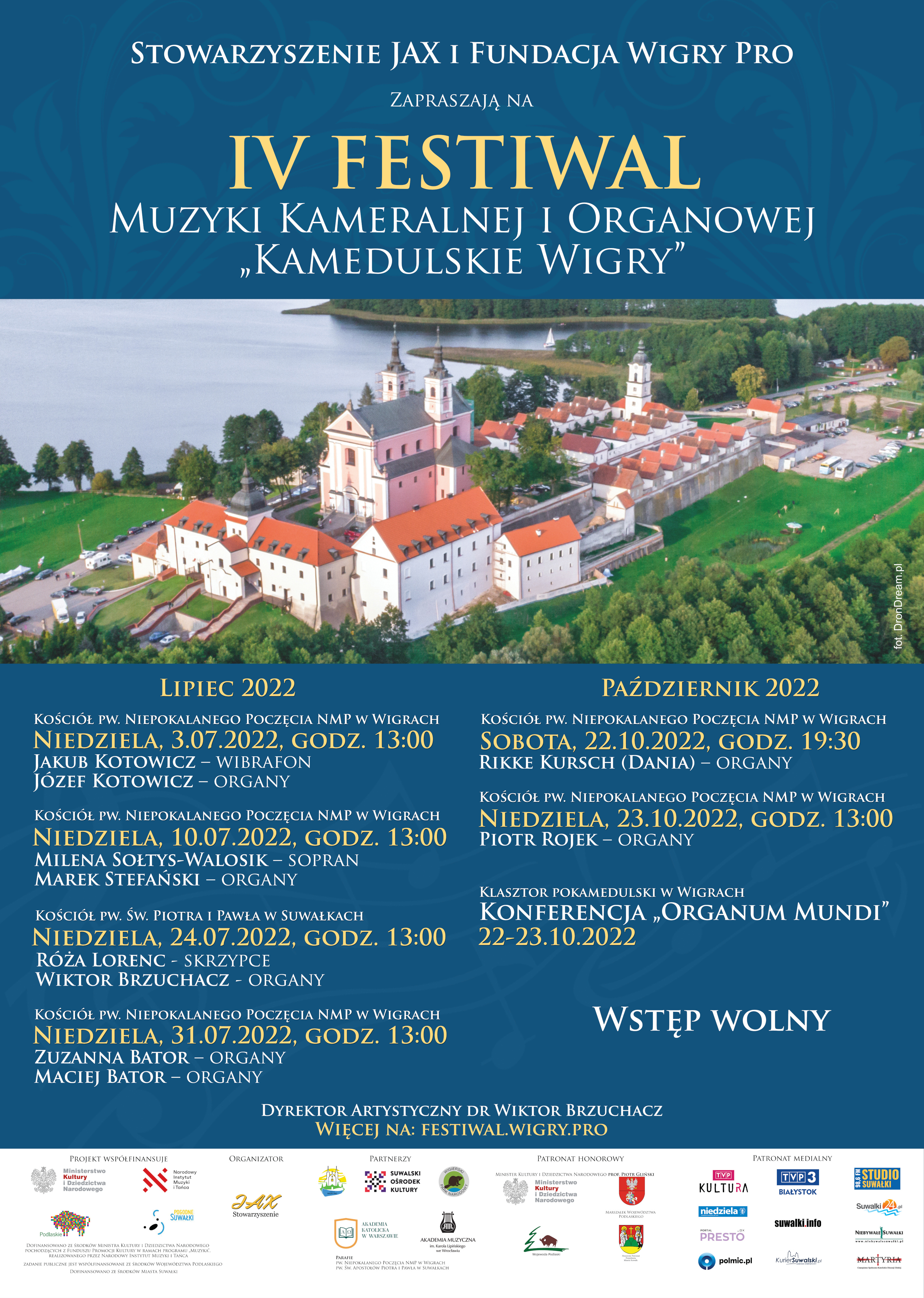 IV Festiwal Muzyki Kameralnej i Organowej „Kamedulskie Wigry” odbywa się do 23 października 2022 roku w zabytkowym Klasztorze Pokamedulskim w Wigrach oraz w Kościele pw. św. Piotra i Pawła w Suwałkach.
