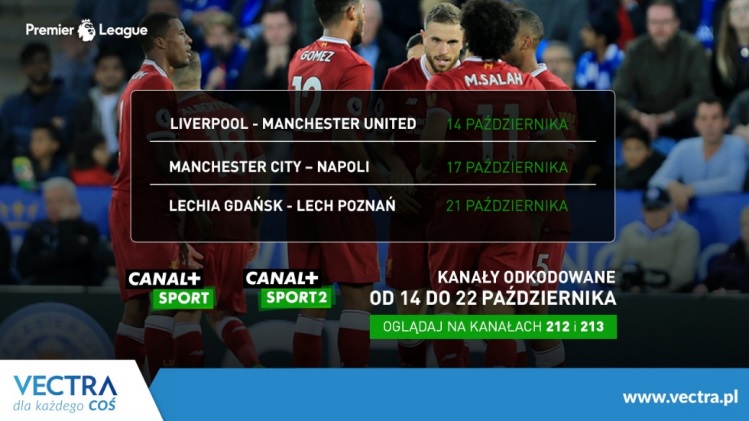 W ramach tej akcji Vectra umożliwi wszystkim swoim widzom obejrzenie polskich hitów serialowych i meczów piłkarskich o najwyższą stawkę, dzięki czasowemu odkodowaniu kanałów Premium. Od 14 października operator udostępni kanały CANAL+, CANAL+ Sport HD, CANAL+ Sport 2 HD i HBO HD w otwartym oknie.