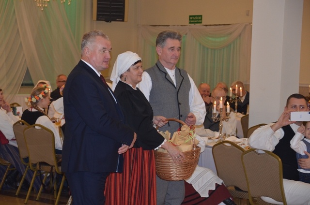 Role Gospodarzy Wigilii pełnili: Małgorzata Danielewicz kierownik zespołu Jezioranki z Wiżajn oraz Józef Murawski kierownik zespołu ludowego Pogranicze z Szypliszk.