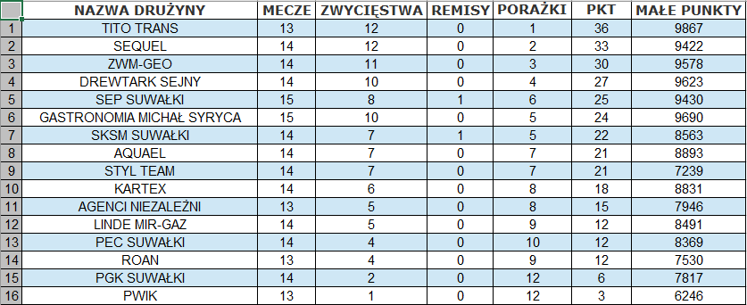 W 14., przedostatniej kolejce spotkaÅ„ indywidualnie najlepiej spisaÅ‚ siÄ™ SÅ‚awomir Raczkowski z ekipy Linde Mir Gaz – 216 punktów. BartÅ‚omiej Å»uchowski dorzuciÅ‚ 177 oczek, Krystyna Å»uchowska – 144, Izabela Å»uchowska – 111 i drużyna, w której wystÄ™puje jeszcze RadosÅ‚aw Å»uchowski pokonaÅ‚a PWiK SuwaÅ‚ki 648:457. Dla PWiK-u punktowali Andrzej Deresz – 128, Sylwester Bernat – 118, Karolina Prokorym – 116 i Marcin Pietrewicz – 95, a w zespole wystÄ™pujÄ… również Waldemar SowiÅ„ski, Adam KrupiÅ„ski i Marcin Martynko.