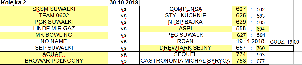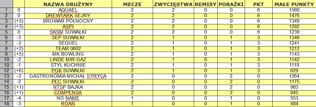 Po dwóch kolejkach kompletem zwyciÄ™stw mogÄ… siÄ™ także pochwalić zespoÅ‚y Browaru PóÅ‚nocnego ASPI oraz Suwalskich Kopalni Surowców Mineralnych. Tabela jest niepeÅ‚na, bo na 19 listopada swoje spotkanie przeÅ‚ożyÅ‚y drużyny Roanu oraz No Name.