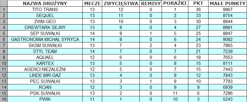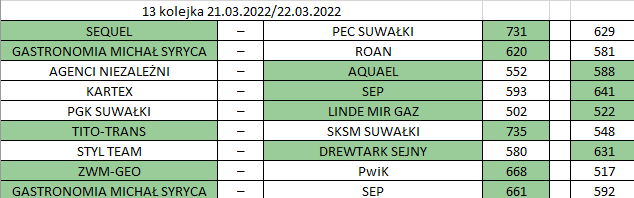 Drużyny prowadzący w tabeli Suwalskiej Ligi Bowlingowej zgodnie powygrywały swoje spotkania w 13. kolejce. Do końca zmagań pozostały już tylko dwie rundy.