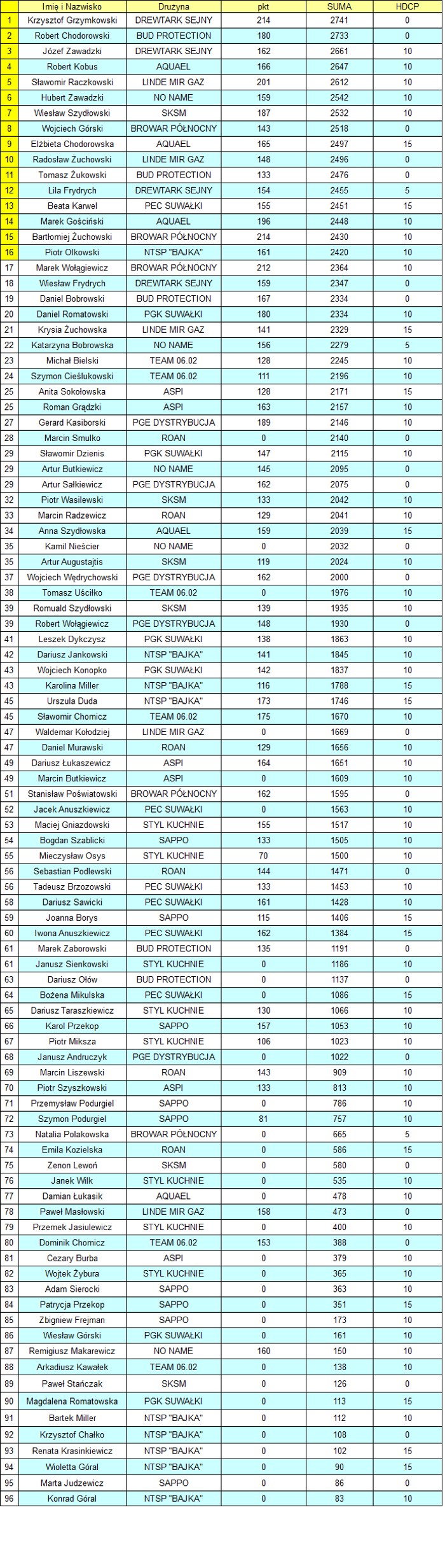 Trofea przypadły także najlepszej zawodniczce. Została nią Elżbieta Chodorowska z Aquaela, z która do końca rywalizowały Beata Karwel z PEC-u Suwałki i Lilla Frydrych. Trzech wymienionych już panów – Krzysztofa Grzymkowskiego, Roberta Chodorowskiego i Józefa Zawadzkiego zawzięcie gonił Robert Kobus z Aquaela.