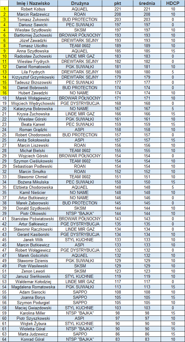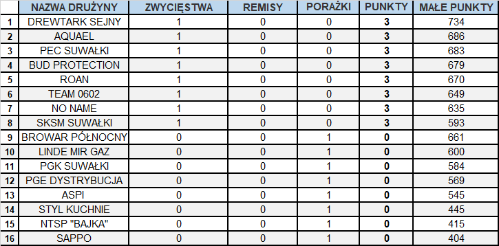 Najlepszym zespoÅ‚em 1. kolejki okazaÅ‚ siÄ™ Drewtark Sejny (na zdjÄ™ciu) , a najwiÄ™cej punktów – 221 (211 + 10) - rzuciÅ‚ Robert Kobus z Aquaela.