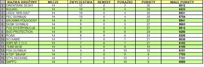 W ekipie Browaru pokładana była nadzieja na to, że z wyłonieniem mistrza trzeba będzie poczekać do samego końca. Drużyna z Sejn wytrzymała psychicznie, w pięknym stylu odparła atak marzących jeszcze o pierwszej lokacie przeciwników. O poziomie tego starcia świadczy fakt, iż oba zespoły uzyskały najwyższe wyniki 14. rundy. Zwycięski Drewtark zdobył miano najlepszej drużyny, a jego zawodnik, Józef Zawadzki, z wynikiem 208 pkt., został MVP kolejki.