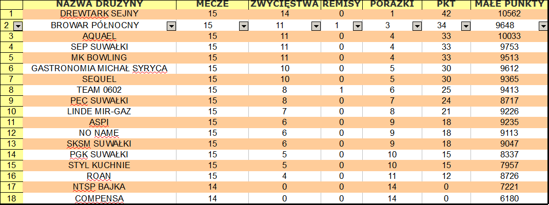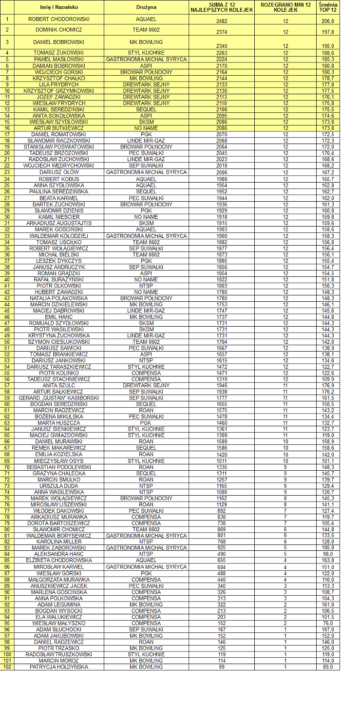 Powoli ostatecznego ksztaÅ‚tu nabiera czoÅ‚owa „16”, która na zwieÅ„czenie 10. edycji Suwalskiej Ligi Bowlingowej spotka siÄ™ w turnieju Masters. Jak pisaliÅ›my, do klasyfikacji brane jest 12 najlepszych gier każdego zawodnika. Dopiero w 15. kolejce dwunasty wystÄ™p zaliczyli Dominik Chomicz z Teamu 0602 oraz Tomasz Å»ukowski z drużyny Styl Kuchnie i od razu ulokowali siÄ™ w czoÅ‚ówce. Duże szanse na awans do „16” ma Anita Szulc z Drewtarku, która do tej pory zagraÅ‚a w 11 spotkaniach.
