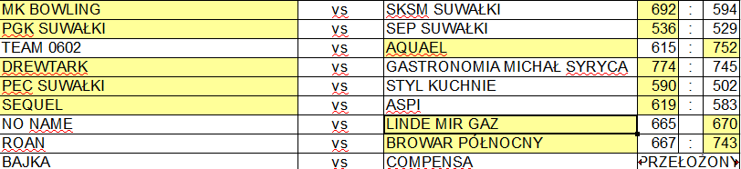 PozycjÄ™ wicelidera straciÅ‚o Stowarzyszenie Energetyków Polskich. SEP co prawda minimalnie, ale sensacyjnie przegraÅ‚ 529:536 z PGK SuwaÅ‚ki i spadÅ‚ na 4. miejsce. Jeszcze mniejszÄ…, ledwie 5-punktowÄ… różnicÄ… skoÅ„czyÅ‚o siÄ™ spotkanie, w którym Linde Mir Gaz, na czele z Maciejem DÄ…browskim (201 pkt.) wygraÅ‚ z No Name 670:665.