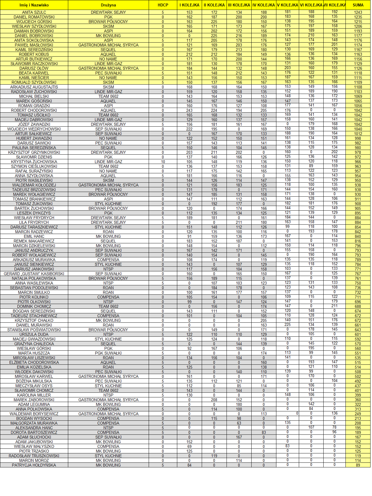 W klasyfikacji indywidualnej Masters znowu doszÅ‚o do zmiany lidera. Daniel Romatowski z PGK SuwaÅ‚ki rzuciÅ‚ tylko 135 punktów. PotkniÄ™cie prowadzÄ…cego skrzÄ™tnie wykorzystaÅ‚a Anita Szulc z Drewtarku. ZdobyÅ‚a 192 punkty (do Masters nie liczy siÄ™ handicup), w sumie ma ich 1243 i różnicÄ… 8 oczek wyprzedza Daniela Romatowskiego. Ponad 1200 punktów maja także Wojciech Górski z Browaru PóÅ‚nocnego i WiesÅ‚aw SzydÅ‚owski z SKSM.