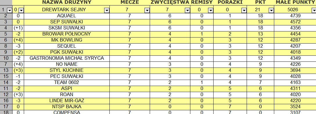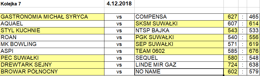 SKSM SuwaÅ‚ki zrównaÅ‚ siÄ™ punktami z Aquaelem. Także 18 punktów ma SEP SuwaÅ‚ki, który zatrzymaÅ‚ kroczÄ…cÄ… ostatnio od zwyciÄ™stwa do zwyciestwa ekipÄ™ MK Bowling 619:571.