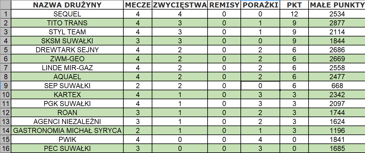 Ten ostatni wynik był zresztą popularny w tej kolejce. Po 202 punkty dla niepokonanego dotąd Sequelu zdobyli Paulina Seredzińska i Bogdan Seredziński. Remigiusz Makarewicz osiągnął 189, a Kamil Seredziński 148 i Sequel bardzo dobrym rezultatem - 741:478 pokonał drużynę PGK Suwałki.