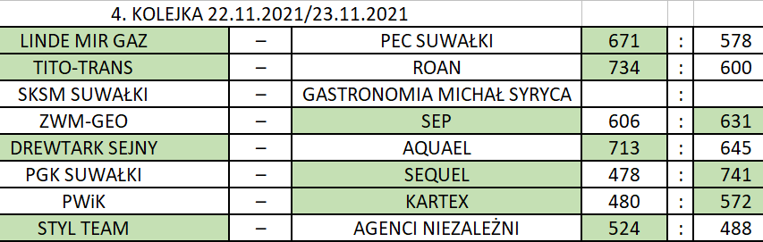 Najlepszym indywidualnym osiągnięciem 4. kolejki Suwalskiej Ligi Bowlingowej - 214 punktów - może pochwalić się Wojciech Wędrychowski ze Stowarzyszenie Energetyków Polskich, którego zespół, po zaciętym meczu, wygrał z ZWM-Geo 631:606.