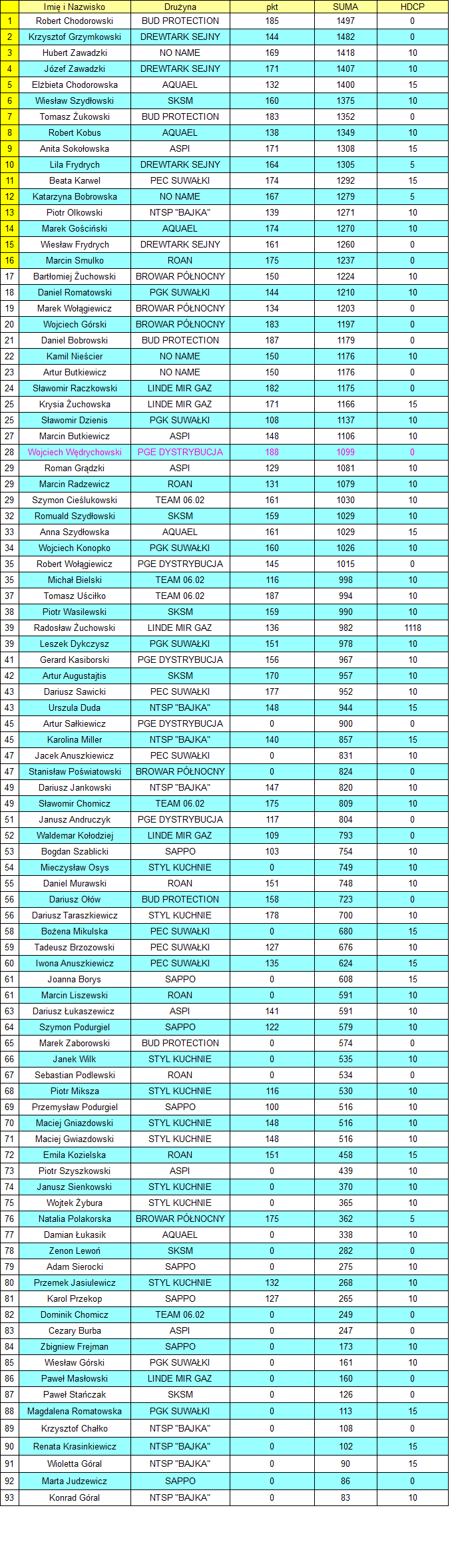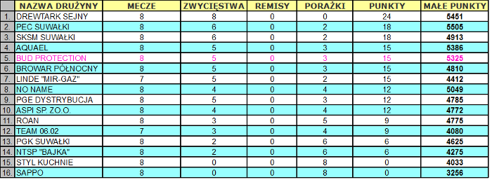 Po bardzo dobrym występie w 8. kolejce na prowadzenie w klasyfikacji indywidualnej wskoczył Robert Chodorowski z Bud Protection, detronizując dotychczasowego lidera Krzysztofa Grzymkowskiego z Drewtarku Sejny. Kolejne miejsca, podobnie jak w ostatnich tygodniach, okupują Hubert Zawadzki (No Name), Józef Zawadzki (Drewtark Sejny) oraz Elżbieta Chodorowska (Aquael).