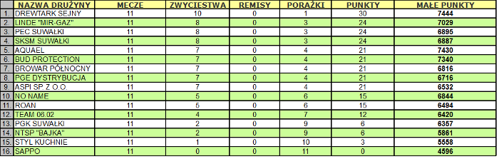 Na 3. miejsce, po wygranej 693:516 z ekipa Styl Kuchnie, wskoczył zespół SKSM Suwałki. Także 693 punkty, w zwycięskim starciu z PGK Suwałki, uzyskał Aquael i podzielił z SKSM mianem najlepszej drużyny kolejki.