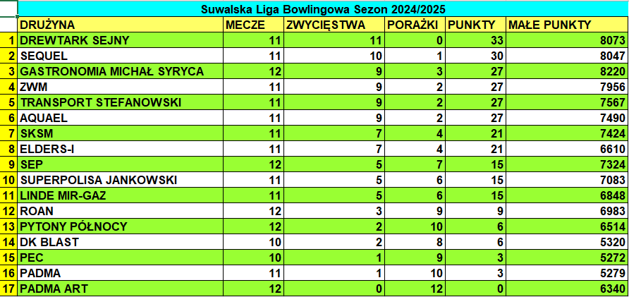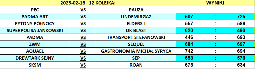 Na miejsce za prowadzÄ…cym w tabeli z kompletem zwyciÄ™stw Drewtarkiem Sejny wysunÄ…Å‚ siÄ™ Sequel, który w niezwykle wyrównanym boju pokonaÅ‚ ZWM 697:694. Pozycje wicelidera straciÅ‚a Gastronomia MichaÅ‚ Syryca, która po kapitalnym meczu przegraÅ‚a z rozpÄ™dzonym Aquaelem 694:742.
