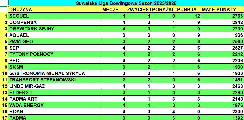 Nieparzysta liczba drużyn uczestniczących w Suwalskiej Lidze Bowlingowej sprawia, że co tydzień jedna z nich pauzuje. W ostatni wtorek ten los spotkał ekipę Transport Stefanowski, której jedno z wcześniejszych spotkań zostało przełożone. Transport rozegrał więc dotąd 2 mecze, oba wygrał, ale w tabeli jest 11.