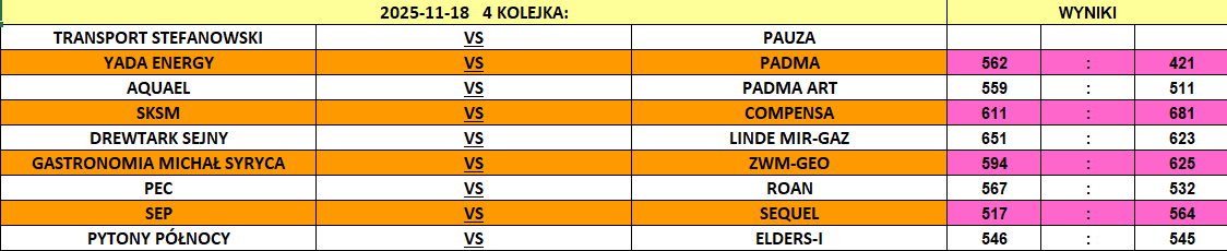 W najbardziej wyrównanym meczu 4. Kolejki, w którym o zwycięstwie zdecydował ledwie 1 pin, Pytony Północy pokonały Elders-ów 546:545.