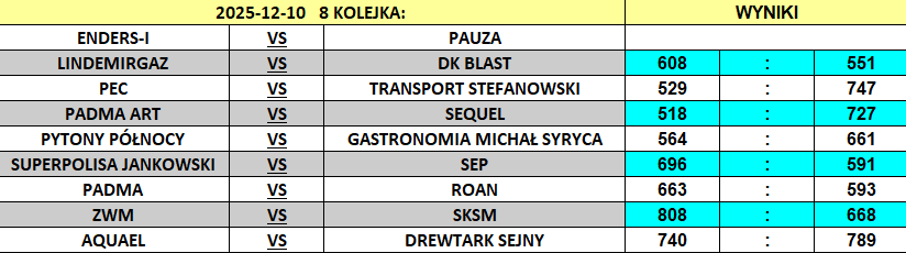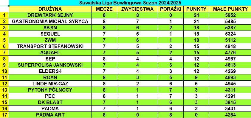 Ósme zwyciÄ™stwo z rzÄ™du odniósÅ‚ Drewtark Sejny, który w porywajÄ…cym meczu wygraÅ‚ z Aquaelem 789:740. Jeszcze wiÄ™cej maÅ‚ych punktów zdobyÅ‚ ZWM, który wygraÅ‚ z zajmujÄ…cy trzecie miejsce w tabeli drużynÄ… SKSM 808:668.