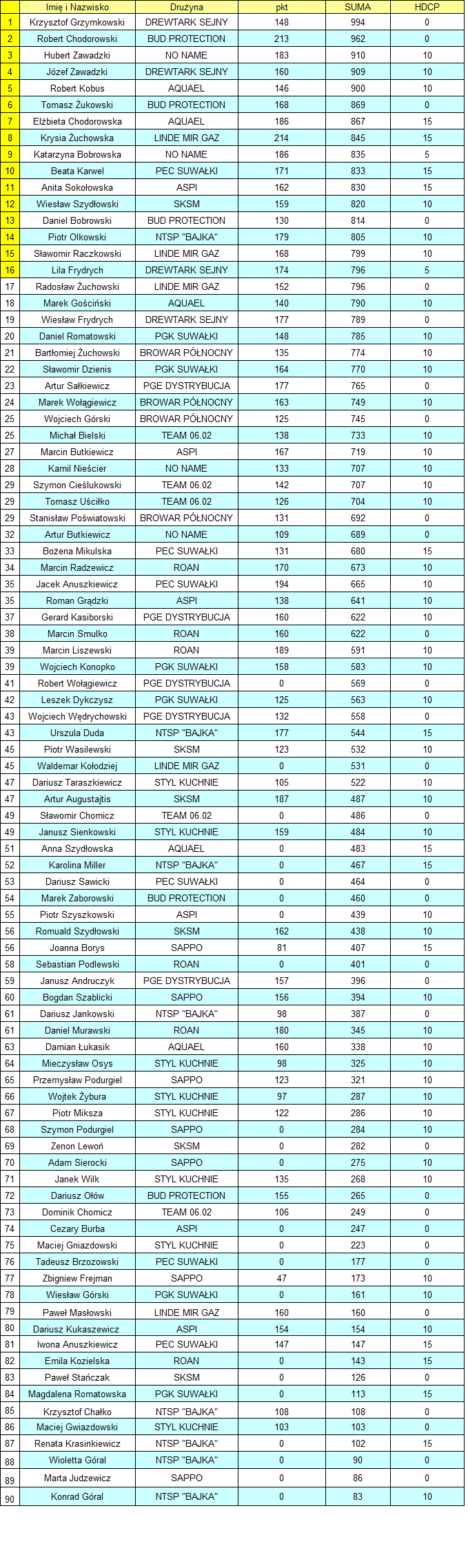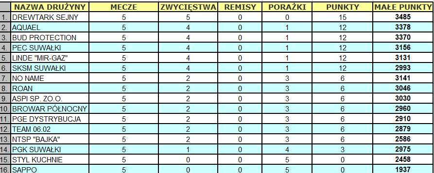 Na szczycie tabeli dalej bez zmian. Prowadzi Drewtark Sejny - 3485 punktów, przed Aquaelem - 3378 i Bud Protection, który traci do drugiego miejsca tylko 8 oczek -3370.