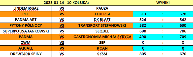 ZajmujÄ…cy 4. miejsce ZWM przeÅ‚ożyÅ‚ swoje spotkanie, a piÄ…ty w tabeli Transport Stefanowski pokonaÅ‚ Pytonów PóÅ‚nocy 630:582, a Elders-i wygrali z drużynÄ… PEC-u 578:513.