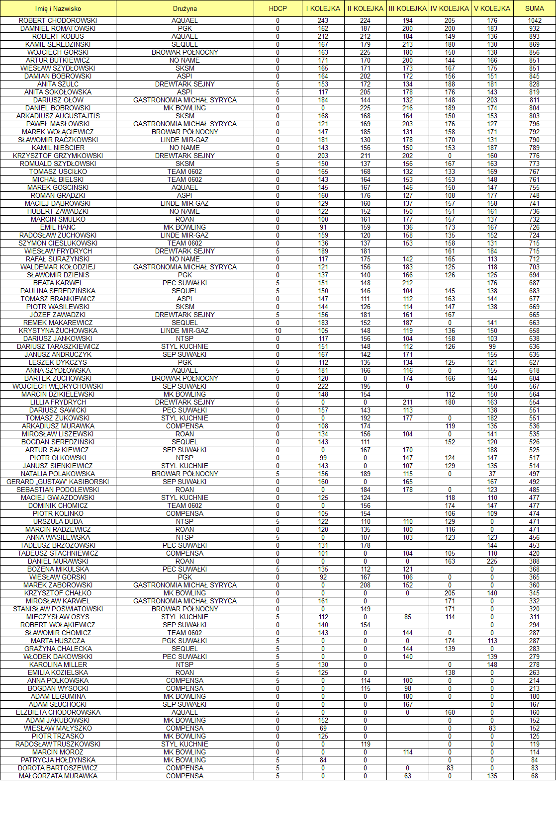 ZajmujÄ…cy drugie miejsce w klasyfikacji indywidualnej Daniel Romatowski (PGK SuwaÅ‚ki) zdobyÅ‚ 183, a liderujÄ…cy Robert Chodorowski (Aquael) – 176 punktów.