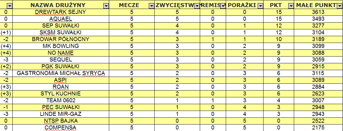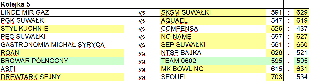 Niezwykle rzadko spotykany w krÄ™gielniach remis sprawiÅ‚, że ekipa Browaru spadÅ‚a z 3. na 6. miejsce w tabeli. O cztery miejsca w górÄ™ powÄ™drowali gospodarze z Mk Bowling, którzy w zaciÄ™tym meczu wygrali z ASPI 631:615 oraz zespóÅ‚ No Name, po zwyciÄ™stwie 627:597 z PEC-em SuwaÅ‚ki.