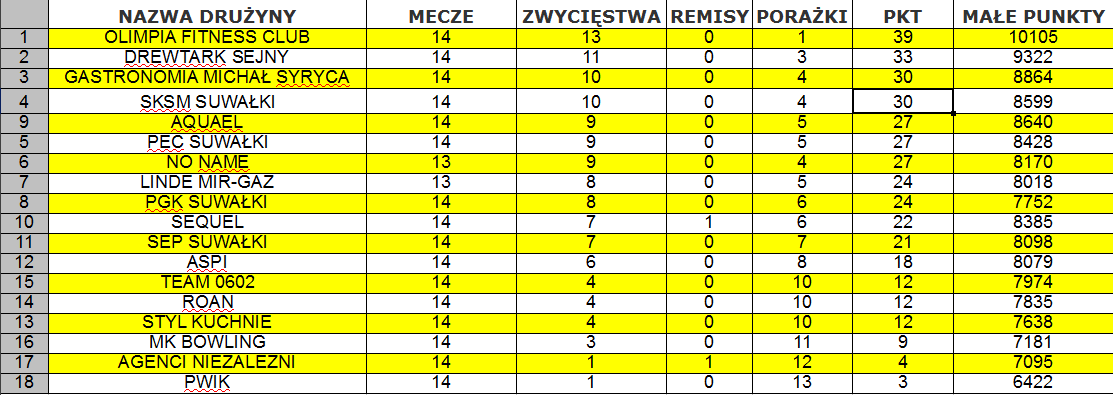 ZespóÅ‚ Olimpii Fitness Club przegraÅ‚ tylko raz (610:650 w 3. kolejce z drużynÄ… No Name) i z jednÄ… porażkÄ… na koncie powinien zakoÅ„czyć rozgrywki. Drewtark Sejny, który schodzil z toru pokonany już trzykrotnie, musi teraz bronić pozyjci wicelidera przed majÄ…cymi tylko o 3 punkty mniej GastronomiÄ… MichaÅ‚ Syryca i Suwalskimi Kopalniami Surowców Mineralnych. Apetyt na podium majÄ… jeszcze Aquael, PEC SuwaÅ‚ki i No Name.