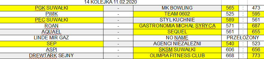 W ciekawie zapowiadajÄ…cym siÄ™ spotkaniu Sequel wygraÅ‚ z Aquaelem 655:561. W najbardziej zaciÄ™tych meczach Stowarzyszenie Energetyków Polskich pokonaÅ‚o Agentów Niezależnych 540:523, a PEC SuwaÅ‚ki wygraÅ‚ z drużynÄ… Styl Kuchnie 589:561.