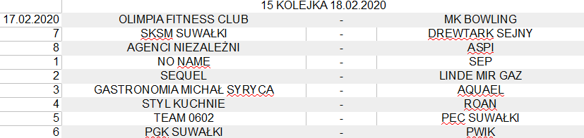 W najblizszy wtorek najciekawiej zapowiada się starcie czwartych w tabeli SKSM Suwałki z Drewtarkiem Sejny oraz mecze Gastronomii Michał Syryca z Aquaelem i mającego o jedno spotkanie rozegrane mniej Linde Mir Gazu z Sequelem.
