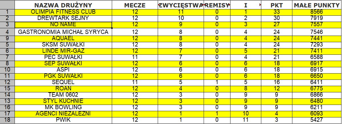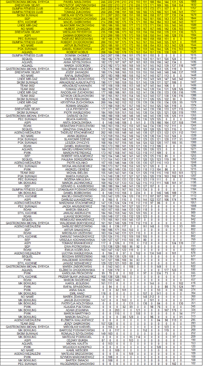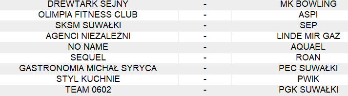 TydzieÅ„ temu zastanawialiÅ›my siÄ™, czy Stowarzyszenie Energetyków Polskich, z rewelacyjnym wówczas Wojciechem WÄ™drychowskim (256 punktów) jest w stanie zatrzymać lidera. OkazaÅ‚o siÄ™, że nie. Olimpia Fitness Club wygraÅ‚a z SEP-em róznicÄ… niemal 200 punktów. Pewne zwyciestwo z ASPI, odniósÅ‚ też wicelider, Drewtark Sejny. Na szczycie tabeli zapanowaÅ‚o status quo, bo trzeci w tabeli zespóÅ‚ No Name po dobrym meczu pokonaÅ‚ ROAN 674:617.