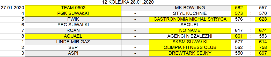 Oprócz Krzysztofa Grzymkowskiego, ponad 200 oczek w 12. kolejce zdobyli Robert Kobus (Aquael) - 208, WiesÅ‚aw SzydÅ‚owski (SKSM) - 207, Hubert Zawadzki (No Name) i StanisÅ‚aw PoÅ›wiatowski (Olimpia Fitness Club) - po 203. Robert Chodorowski, inny zawodnik zespoÅ‚u lidera, rzucil równo 200 oczek.