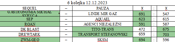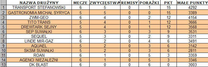 Nowym wiceliderem została Gastronomia Michał Syryca, która wygrała z Linde Mir Gaz 691:547. Gastronomia jest teraz jedynym niepokonanym zespołem. Ma tyle samo punktów co lider i rozegrała o jeden mecz mniej.