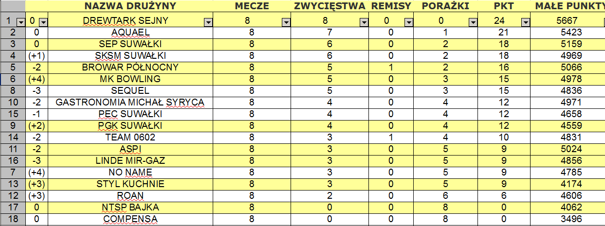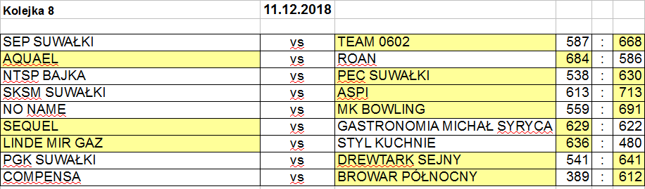 RóżnicÄ… także 100 punktów (713:613) ASPI, dziÄ™ki znakomitej grze Anity SokoÅ‚owskiej i Damiana Bobrowskiego pokonaÅ‚o SKSM. Dla górników z Suwalskich Kopalni Surowców Mineralnych byÅ‚ to drugi przegrany mecz, ale mogli pocieszać siÄ™ tym, że porażkÄ™ ponieÅ›li tez rywalizujÄ…cy z nimi o najniższy stopieÅ„ podium reprezentanci Stowarzyszenia Energetyków Polskich. SEP ulegÅ‚ 587:668 Teamowi 0602. Bardzo wysokÄ… formÄ™ w tej drugiej, zwyciÄ™skiej ekipie utrzymuje Dominik Chomicz. Najlepszy gracz 8. kolejki rzuciÅ‚ 225 punktów, a przed tygodniem, przypomnijmy, osiÄ…gnÄ…Å‚ 211 oczek.