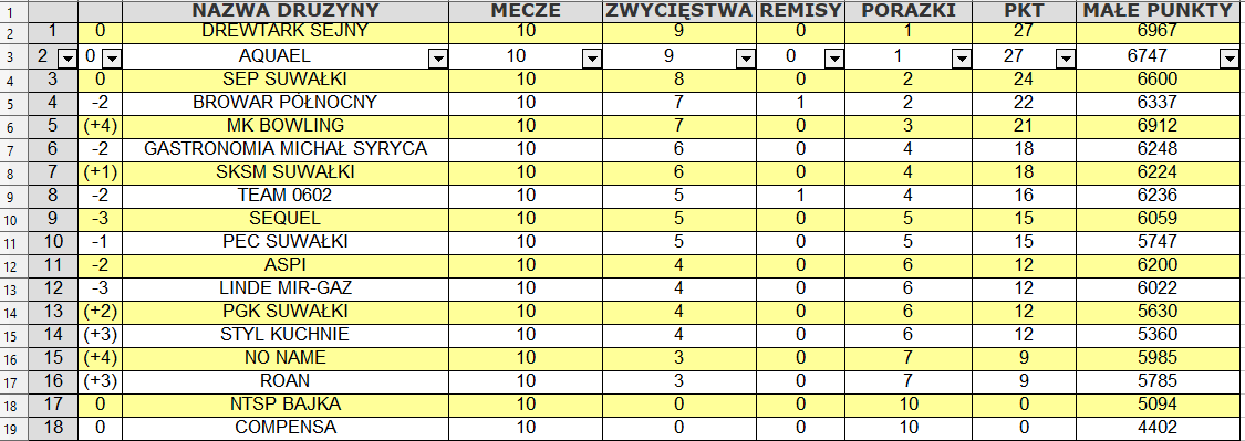 Bez zmian wyglÄ…da Å›cisÅ‚a czoÅ‚ówka klasyfikacji Masters. Prowadzi PaweÅ‚ MasÅ‚owski z Gastronomii MichaÅ‚ Syryca, który do swojego dorobku dopisaÅ‚ 190 punktów i o 20 oczek wyprzedza Daniela Bobrowskiego z Mk Bowling - 203 pkt. Także 203 punkty w 10. kolejce zdobyÅ‚ Janusz Andruczyk z SEP. Jeszcze lepszy wynik - 247 punktów osiagnÄ…Å‚ Robert Chodorowski ze wspóÅ‚liderujacego Aquaela, który po dwóch kolejkach nieobecnoÅ›ci powoli wraca na szczyty kwalifikacji indywidualnej.