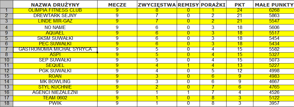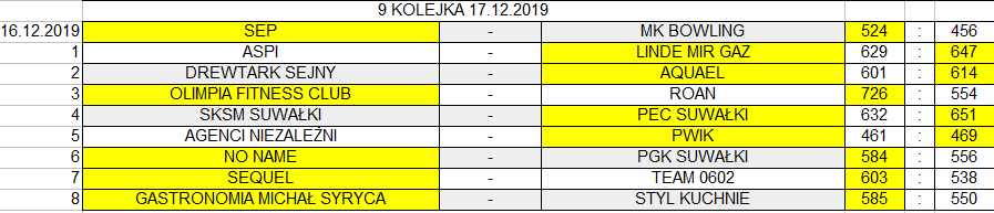 DziewiÄ…ta runda obfitowaÅ‚a w wyrównane spotkania. Aquael pokonaÅ‚ wicelidera, Drewtark Sejny 614:601. Krystyna Å»uchowska rzucila okragÅ‚e 200 pkt. i poprowadziÅ‚a Linde Mir Gaz do siódmego zwyciÄ™stwa z rzÄ™du - 647:629 z ASPI. PEC pokonaÅ‚ SKSM 651:632, ekipa No Name wygraÅ‚a z PGK 584:556, a Gastronomia MichaÅ‚ Syryca pokonaÅ‚a Styl Kuchnie 585:550.