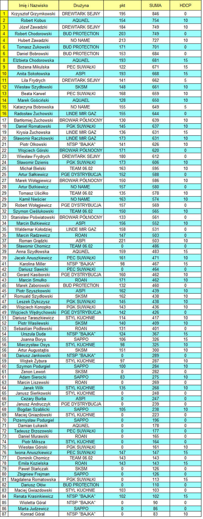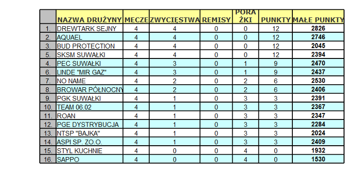 Po czterech kolejkach spotkań, na czele klasyfikacji indywidualnej pozostaje Krzysztof Grzymkowski z Drewtarku, przed Robertem Kobusem z wiceliderującej druzyny Aquaelu oraz swoim klubowymo kolegą Józefem Zawadzkim, który ma tyle samo punktów, co zajmujący czwarte miejsce w stawce Robert Chodorowski z zespołu Bud Protection.