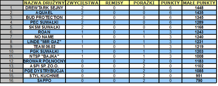 Aquael (na zdjęciu) odniósł drugie zwycięstwo z rzędu, pokonał ekipę spółki ASPI 749:557. Nie zdołał jednak wyprzedzić Drewtarku Sejny, który wygrał z PGE Dystrybucją 714:516. Drużyna z Sejn utrzymała pozycje lidera głównie dzięki znakomitej dyspozycji Krzysztofa Grzymkowskiego, który uzyskał aż 254 punkty.