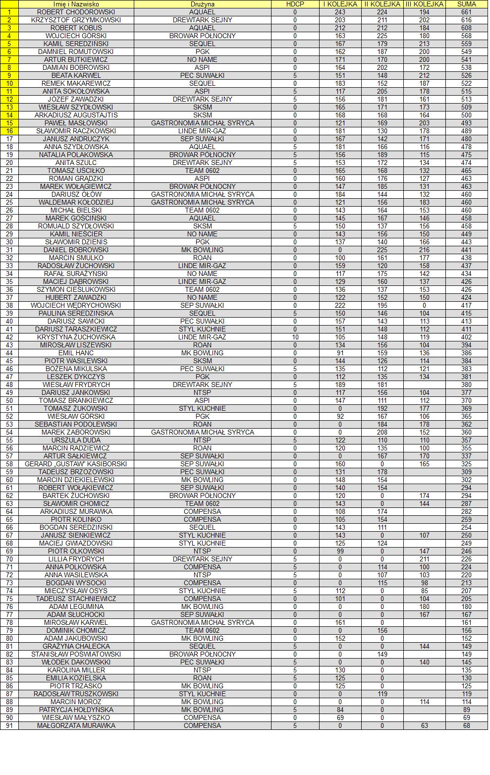 Coraz ciekawiej przedstawia siÄ™ rywalizacja o indywidualne zwyciÄ™stwo i miejsce w czoÅ‚owej „16”, która na koniec zmierzy siÄ™ w turnieju Masters. Po odjÄ™ciu handicupu. Beata Karwel dopisaÅ‚a sobie 212, a Lilla Frydrych 211 punktów. Najlepszy wynik indywidualny (podobnie jak przed tygodniem, kiedy wygraÅ‚ ex equo z Wojciechem Górskim – po 225 pkt.) uzyskaÅ‚ Daniel Bobrowski z Mk Bowling – 216. Kamil SeredziÅ„ski z Sequelu rzuciÅ‚ 213, Pawel masÅ‚owski z Gastronomii – 203, Krzysztof Grzymkowski z Drewtarku – 202, a Artur Butkiewicz z No Name oraz Daniel Romutowski z PGK – okrÄ…gÅ‚e 200 punktów.