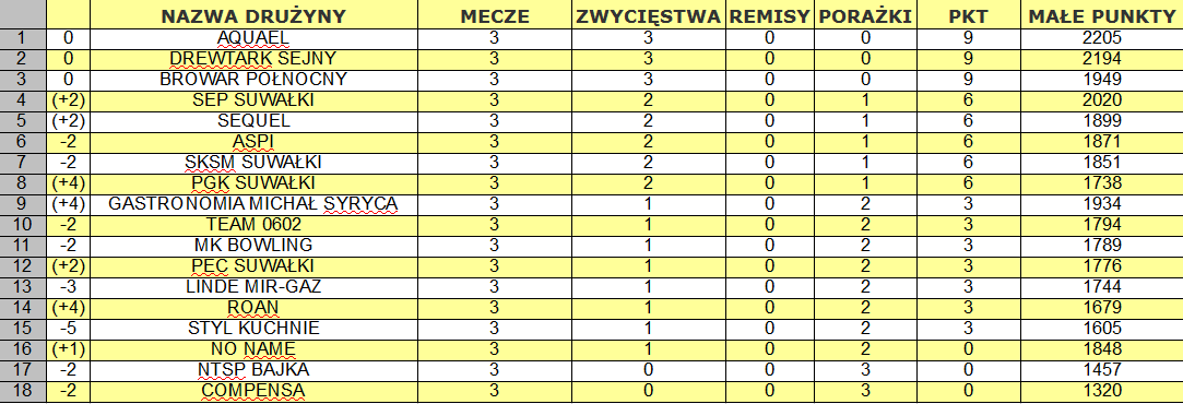 Kompletem zwyciÄ™stw mogÄ… siÄ™ pochwalić już tylko trzy zespoÅ‚y – Aquael, Drewtark Sejny i Browar PóÅ‚nocny. NajwiÄ™cej punktów dla Drewtarku, wliczajÄ…c handicup, zdobyÅ‚a Lilla Frydrych, która wyleczyÅ‚a już kontuzje dÅ‚oni i po raz pierwszy w tej jubileuszowej, 10. edycji punktowaÅ‚a dla swojej ekipy. Tylko sejnianie rzucili najwiÄ™cej ponad 700 „oczek”- 723. W poprzedniej kolejce, przypomnijmy mieli ich 760, Aquael aż 774, a Browar – 753.