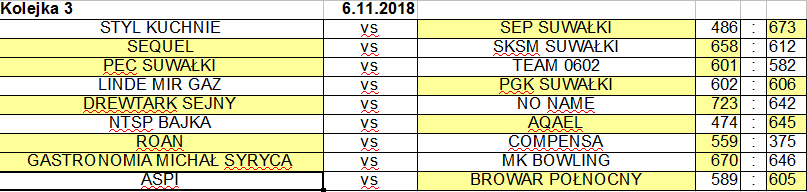 Trzecia kolejka zaczęła siÄ™ od poniedziaÅ‚kowego spotkania, w którym historyczne zwyciÄ™stwo nad gospodarzami z Mk Bowling odnieÅ›li reprezentanci Gastronomii MichaÅ‚ Syryca. PozostaÅ‚e mecze zostaÅ‚y rozegrane we wtorek.