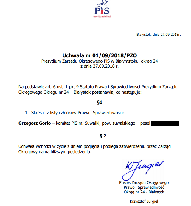 Jeszcze przed południem Grzegorz Gorlo, kandydat Suwalskiego Porozumienia Prawicy na prezydenta miasta nie wiedział, czy został wyrzucony, czy też nie z Prawa i Sprawiedliwości. Po południu biuro poselskie Jarosława Zielińskiego upubliczniło dzisiejszą uchwałę prezydium okręgowego zarządu partii.