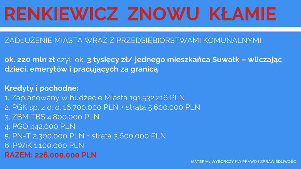 Przy swoich zastrzeżeniach, oskarżeniach i obawach dotyczących zadłużenia i zdolności kredytowej miasta pozostał Grzegorz Mackiewicz, kandydat Prawa i Sprawiedliwości na prezydenta Suwałk. W rewanżu, to on zarzucił kłamstwa Czesławowi Renkiewiczowi.