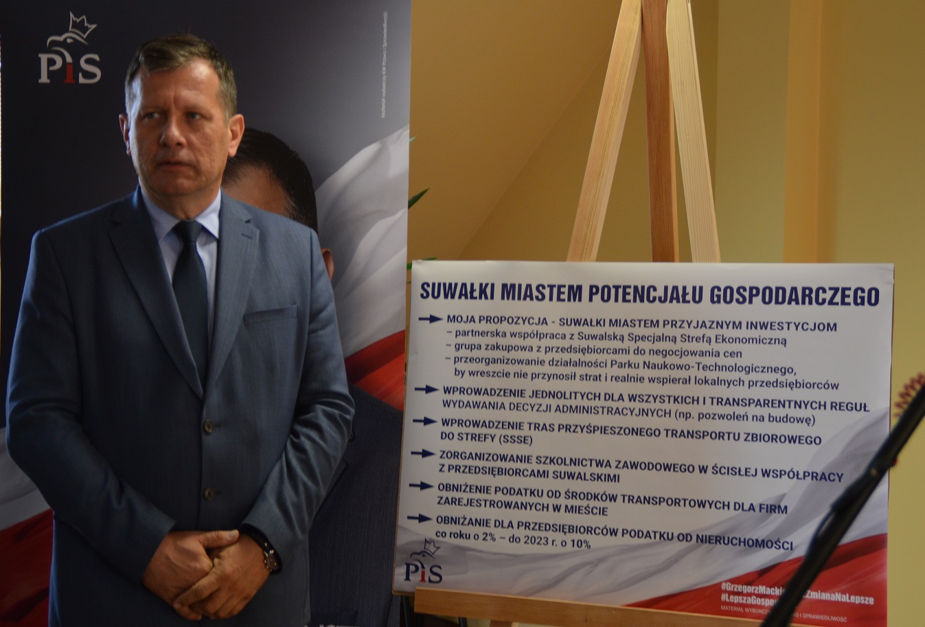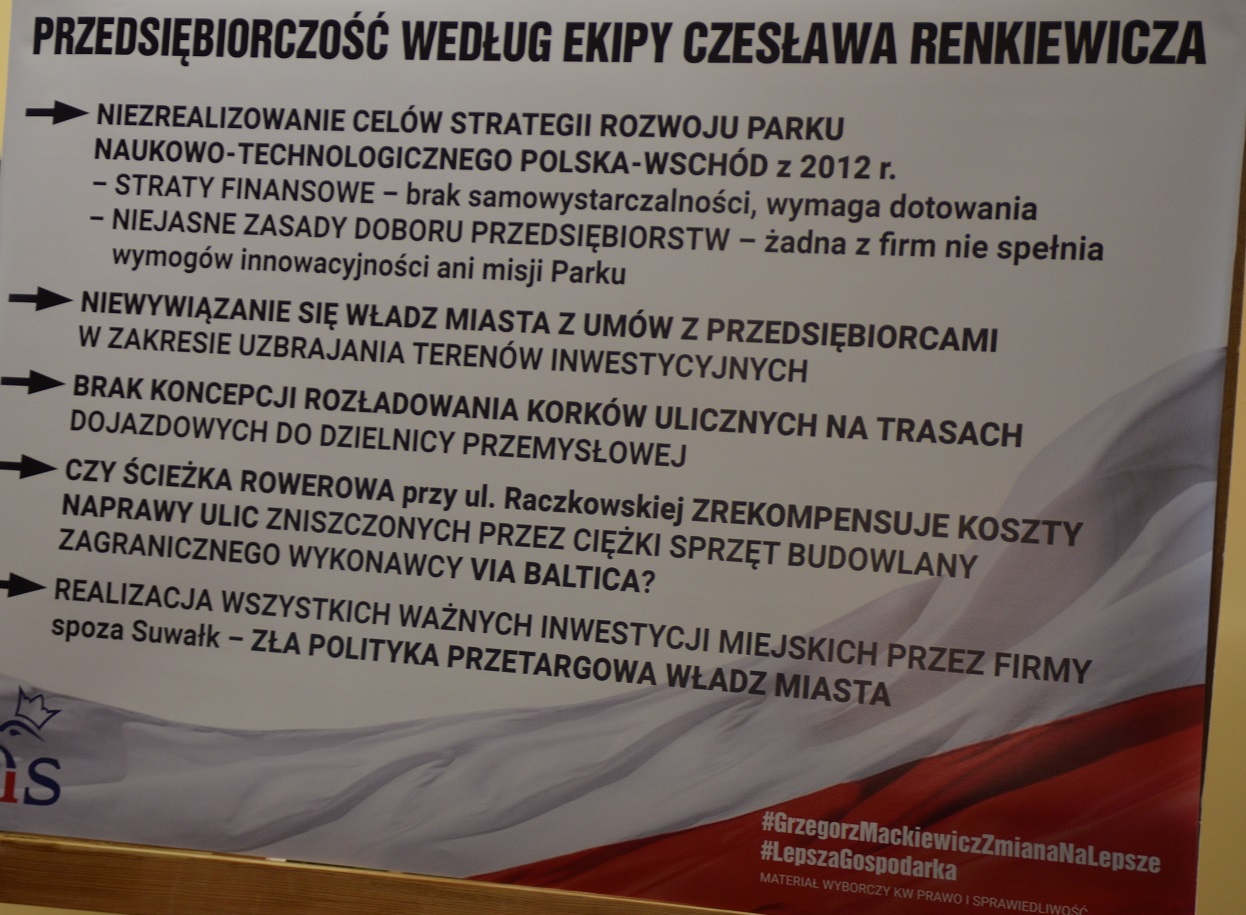 O zÅ‚ej, ich zdaniem, dziaÅ‚alnoÅ›ci, nie przynoszÄ…cego innowacyjnych korzyÅ›ci a przynoszÄ…cego straty Parku Naukowo-Technologicznego, braku terenów inwestycyjnych i zakorkowanych ulicach, źle przygotowywanych przetargach na wykonawców inwestycji mówili towarzyszÄ…cy Grzegorzowi Mackiewiczowi radny Jacek Juszkiewicz oraz Jacek Bielenik i Piotr Wasilewski, kandydaci PiS do rady Miejskiej SuwaÅ‚k.