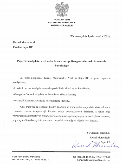 Kornel Morawiecki – legenda opozycji antykomunistycznej, twórca Solidarności Walczącej, poseł i ojciec premiera Mateusza Morawieckiego poparł Leszka Lewoca i Grzegorza Gorlę, kandydatów do Rady Miejskiej i na prezydenta Suwałk.