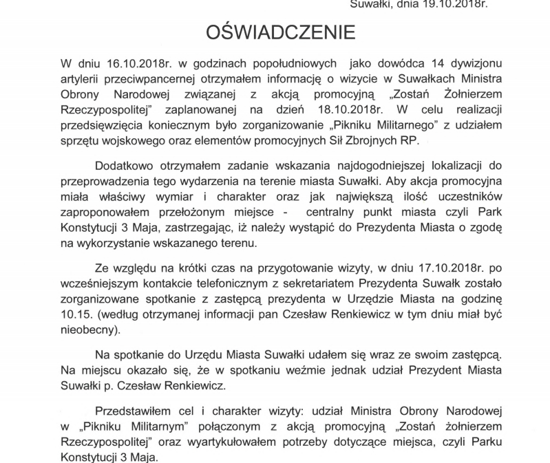 Dlaczego nie byÅ‚o oficjalnej korespondencji, w wydanym po poÅ‚udniu oÅ›wiadczeniu wyjaÅ›nia ppÅ‚k Krzysztof Åšwiderski, dowódca 14 Suwalskiego Dywizjonu Artylerii Przeciwpancernej.