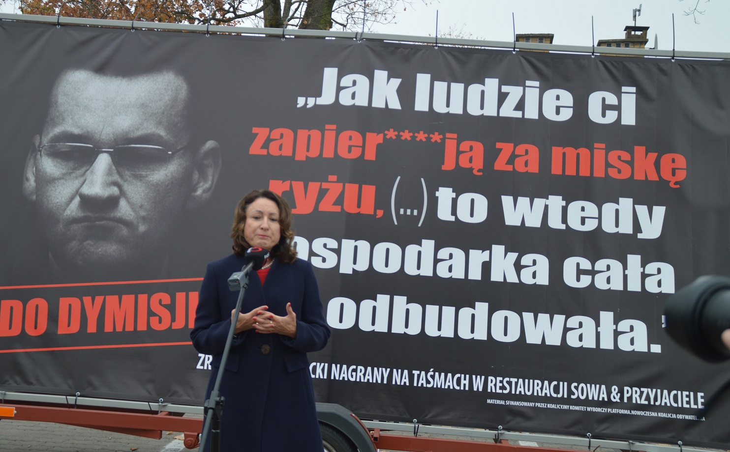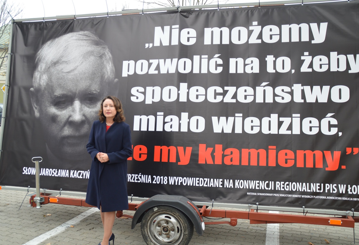 Billboardy z "Konwoju wstydu", akcji informacyjnej Platformy Obywatelskiej w ostatnim dniu kampanii wyborczej zaprezentowała w Suwałkach posłanka tej partii Bożena Kamińska.