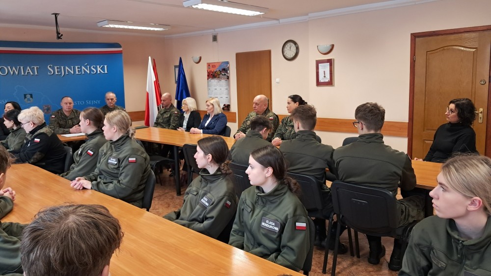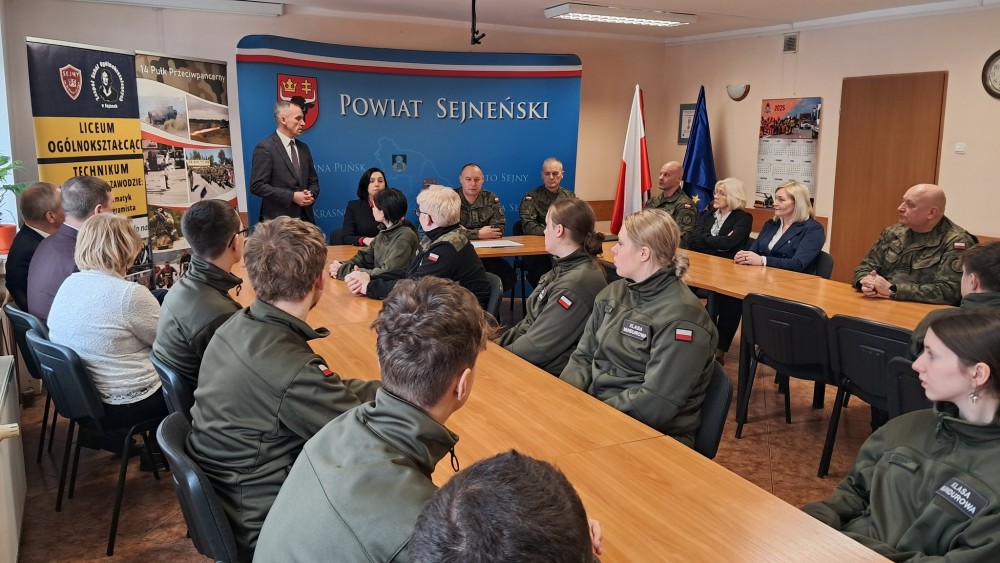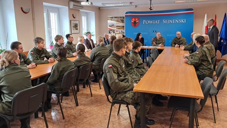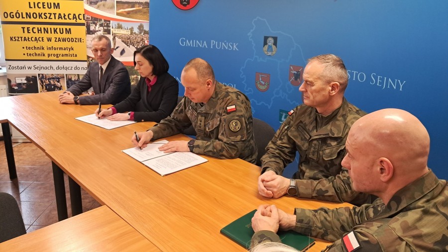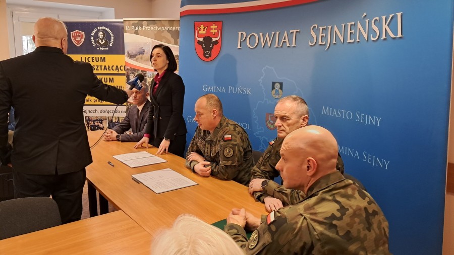 W poniedziałek, 17 lutego 2025 r. w Starostwie Powiatowym w Sejnach podpisano porozumienie o współpracy pomiędzy Zespołem Szkół Ogólnokształcących w Sejnach a 14 Suwalskim Pułkiem Przeciwpancernym im. Marszałka Józefa Piłsudskiego.