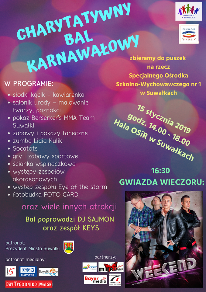 We wtorek, 15 stycznia w hali Ośrodka Sportu i Rekreacji w Suwałkach odbędzie się bal charytatywny, podczas którego prowadzona będzie zbiórka do puszek na zakup pomocy, montaż podjazdu dla wózków do sali gimnastycznej dla dzieci i młodzieży ze Specjalnego Ośrodka Szkolno-Wychowawczego w Suwałkach. Bal poprowadzi DJ Sajmon, a gwiazdą wieczoru będzie doskonale znany nie tylko suwalczanom zespół Weekend.